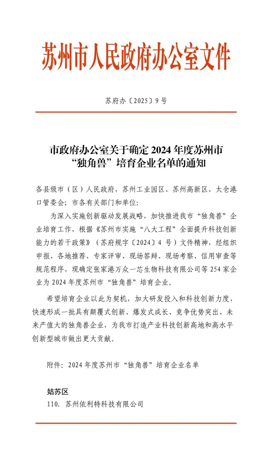 2025211日,蘇州——近日,蘇州市政府正式發布《2024年度蘇州市獨角獸培育企業名單》,蘇州依利特科技有限公司作為姑蘇區首家且唯一入選企業,成功躋身這一具有戰略意義的創新梯隊。這一里程碑式突破,標志著姑蘇區在培育高成長性科技企業、構建現代化產業體系方面取得重要進展。