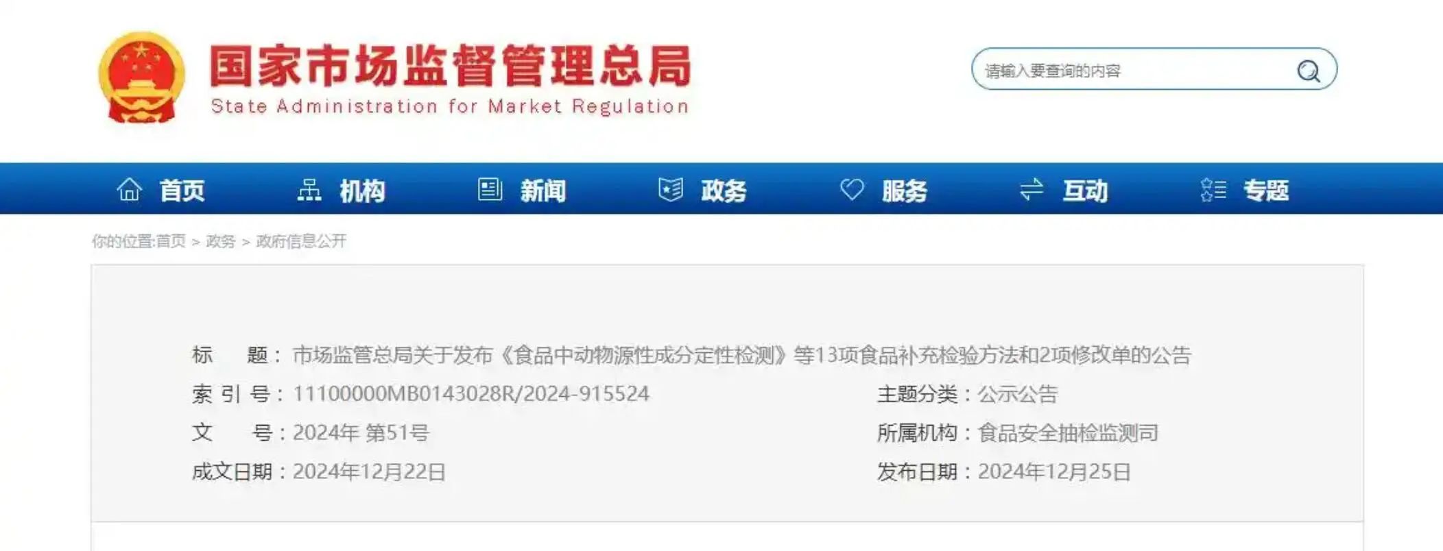 根據(jù)《中華人民共和國食品安全法實(shí)施條例》有關(guān)規(guī)定,近期,市場(chǎng)監(jiān)管總局批準(zhǔn)發(fā)布《食品中動(dòng)物源性成分定性檢測(cè)》等13項(xiàng)食品補(bǔ)充檢驗(yàn)方法和2項(xiàng)修改單。