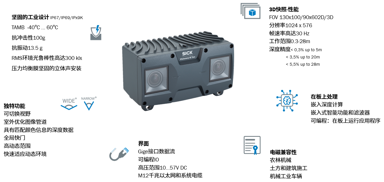 出口市場(chǎng)拓展:中國(guó)工程機(jī)械出口占比持續(xù)提升(2023年挖掘機(jī)出口占比41%),東南亞、非洲等地區(qū)對(duì)性價(jià)比高、適應(yīng)性強(qiáng)的設(shè)備需求旺盛。SICK的3D雙目相機(jī)Visionary-B Two便于快速適配不同地區(qū)機(jī)械標(biāo)準(zhǔn),搶占海外智能化升級(jí)先機(jī)。