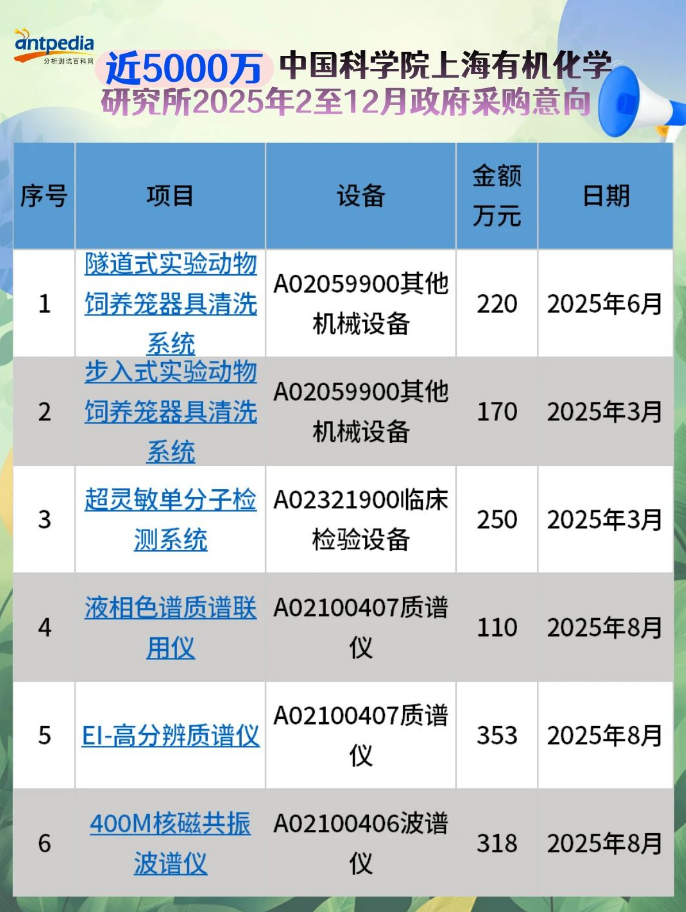 中國科學(xué)院上海有機(jī)化學(xué)研究所2025年2至12月政府采購意向發(fā)布,預(yù)算金額4895萬,采購項目13個。