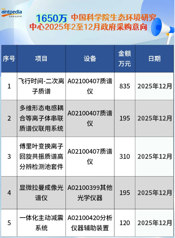 中國科學院生態(tài)環(huán)境研究中心2025年2至12月政府采購意向公開,預算金額共計1655 萬,采購項目5個,含3個質(zhì)譜儀相關采購項目,1個光譜儀采購項目以及1個分析儀器輔助裝置。