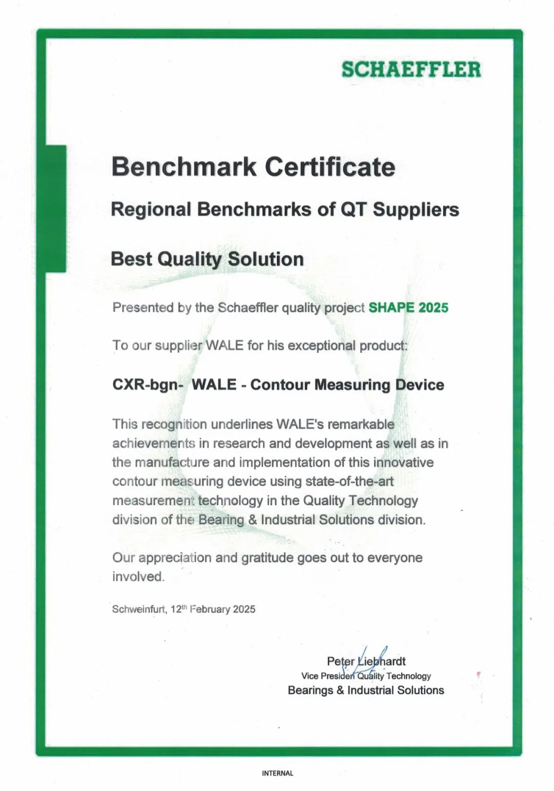 近日,威爾輪廓儀榮獲舍弗勒(Schaeffler)B&IS質量技術認證。