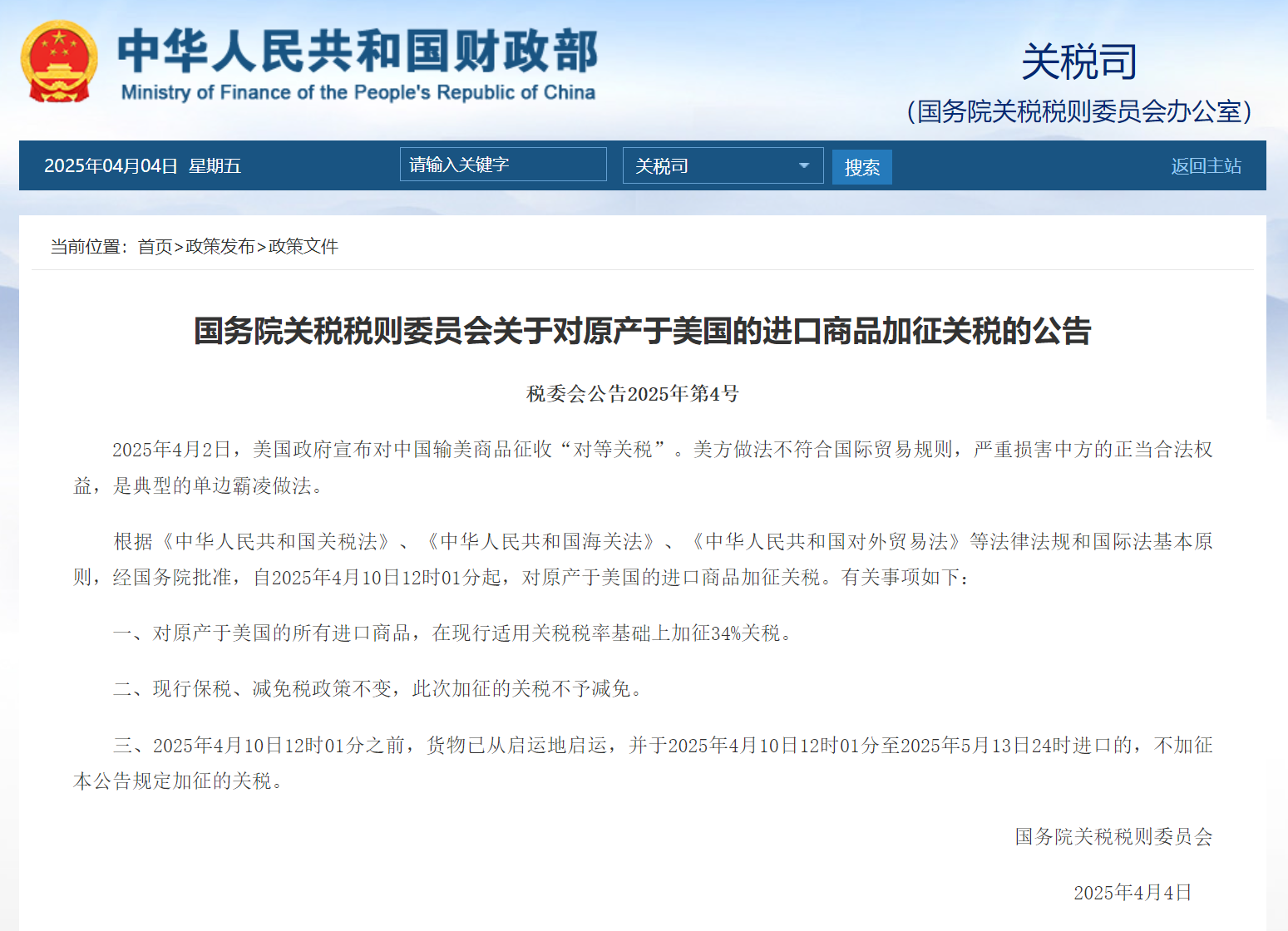4月2日,美國政府宣布對所有貿易伙伴加征“對等關稅”,對中國商品加征稅率高達34%;4月4日,中國國務院關稅稅則委員會發布公告,自4月10日起對原產于美國的所有進口商品同等加征34%關稅。