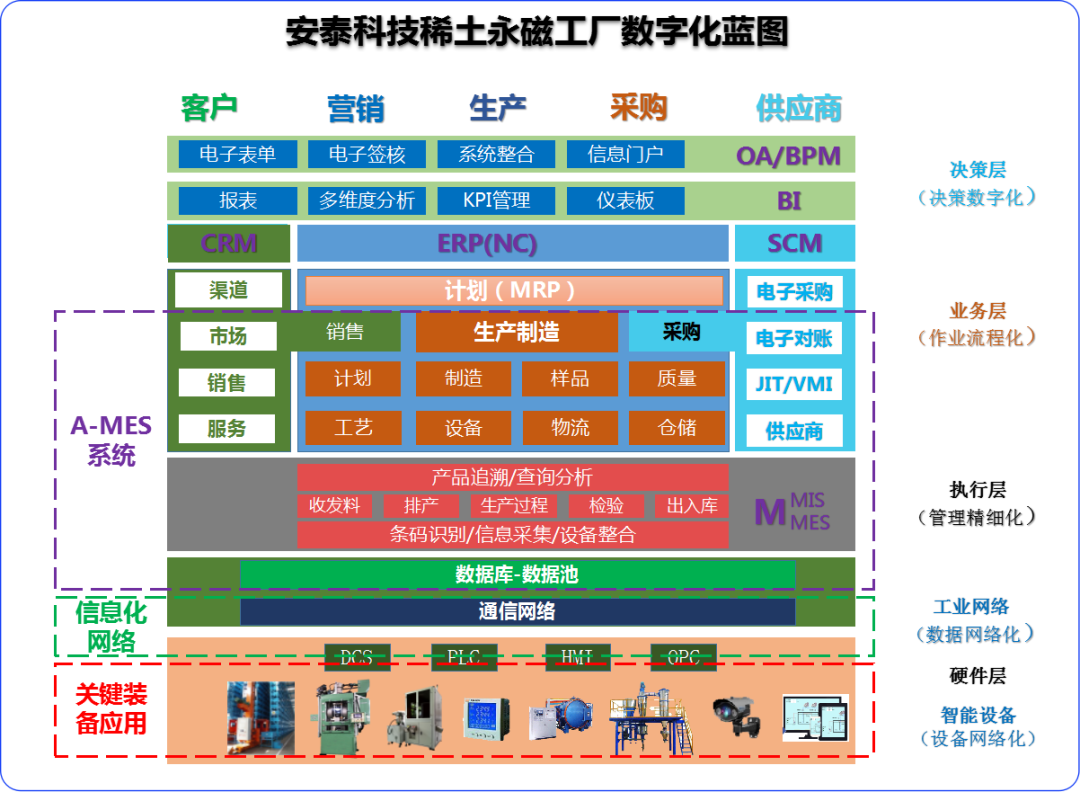 該項目通過建設(shè)統(tǒng)一的設(shè)備工業(yè)網(wǎng)絡(luò)實現(xiàn)設(shè)備的實時數(shù)據(jù)采集,結(jié)合生產(chǎn)制造系統(tǒng)數(shù)據(jù)信息,串聯(lián)決策層、執(zhí)行層以及設(shè)備層,打通數(shù)據(jù)壁壘。項目適合復(fù)雜工業(yè)流程、多品種、大批量的定制化稀土永磁行業(yè)制造工廠,推廣和復(fù)制性強,對國內(nèi)稀土永磁行業(yè)其他工廠具有廣泛的借鑒意義。下一步,安泰科技將繼續(xù)完善信息管理平臺功能,增加產(chǎn)品數(shù)字化研發(fā)設(shè)計與可制造性設(shè)計方面的緊密聯(lián)動,實施制造資源量化,開發(fā)適合稀土永磁行業(yè)特色的計劃排程(APS),擴大智能協(xié)同作業(yè)場景。