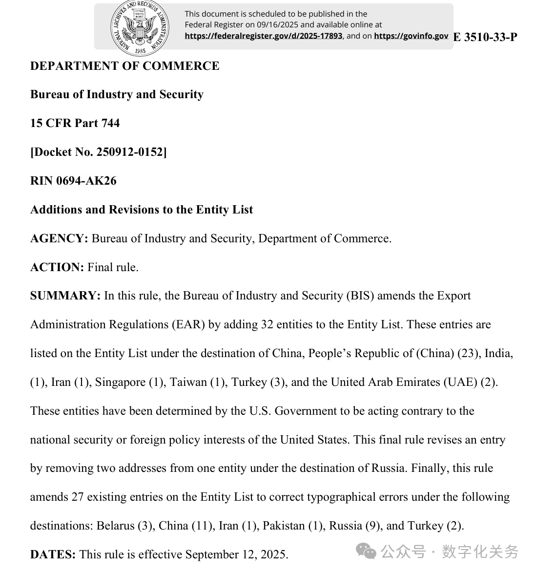 美國商務部工業(yè)與安全局(BIS)于9月12日在美國聯(lián)邦公報發(fā)布公告,通過修訂《出口管理條例》(EAR),將 32 家實體新增至實體清單,其中有23家是中國公司,具體清單、列入實體清單的理由及管制措施如下表(表中提及的列入實體清單的理由為BIS方面指認,不代表本號對該理由或相關事實的認可):