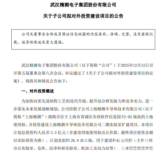 12月12日,精測(cè)電子(300567.SZ)公布,為加快向更先進(jìn)制程工藝的迭代升級(jí),提升綜合研發(fā)能力和競(jìng)爭(zhēng)實(shí)力,進(jìn)一步落實(shí)未來(lái)發(fā)展戰(zhàn)略規(guī)劃,公司控股子公司上海精測(cè)半導(dǎo)體技術(shù)有限公司(簡(jiǎn)稱“上海精測(cè)”)擬購(gòu)買(mǎi)位于上海市青浦區(qū)市西軟件信息園F2-05地塊的土地使用權(quán),并投資建設(shè)上海精測(cè)半導(dǎo)體技術(shù)有限公司二期實(shí)驗(yàn)室擴(kuò)建項(xiàng)目。