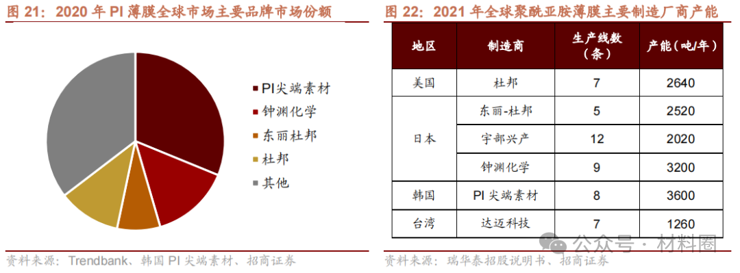 PI薄膜行業呈寡頭壟斷,產能集中于美、日、韓。生產高性能PI膜對設備定制、制作工藝、技術人才等方面要求苛刻,再加上發達國家行業寡頭對PI薄膜生產技術、生產工藝進行嚴格保護。目前這一領域呈現寡頭壟斷的競爭格局,90%以上的市場份額掌握在美國、日本、韓國生產商的手中。杜邦(Dupont)、日本宇部興產(Ube)、鐘淵化學(Kaneka)、日本三菱瓦斯MGC、韓國PI尖端素材(原SKPI)以及中國臺灣地區達邁科技(Taimide)是當前全球聚酰亞胺薄膜的主要生產商。