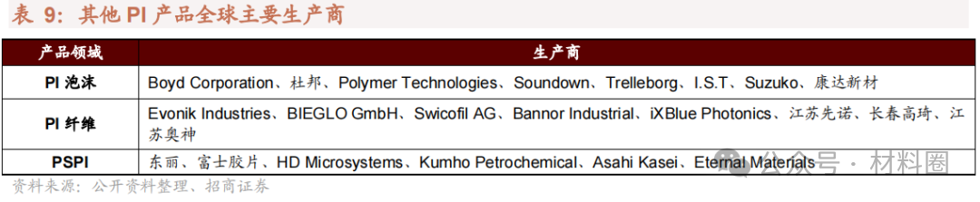其他PI產品應用大多局限于軍事領域,尚未形成大規模商業化應用。聚酰亞胺纖維目前售價較高,目前主要以其獨特的低溫適用性(勝任外太空-100℃以下溫度環境)用于航空航天領域。目前實現大規模生產的廠商只有目前德國EvonikP84纖維)和我國長春高琦(軼綸纖維)。PI泡沫目前最為重要的應用為艦艇用隔熱降噪材料,美國海軍已把 PI 泡沫用作所有水面艦艇和潛艇的隔熱隔聲材料,INSPEC 公司生產的SOLIMIDE 泡沫已被超過 15 個國家制定用于海軍船舶的隔熱隔聲體系,但其暫未大規模進入民用領域。
