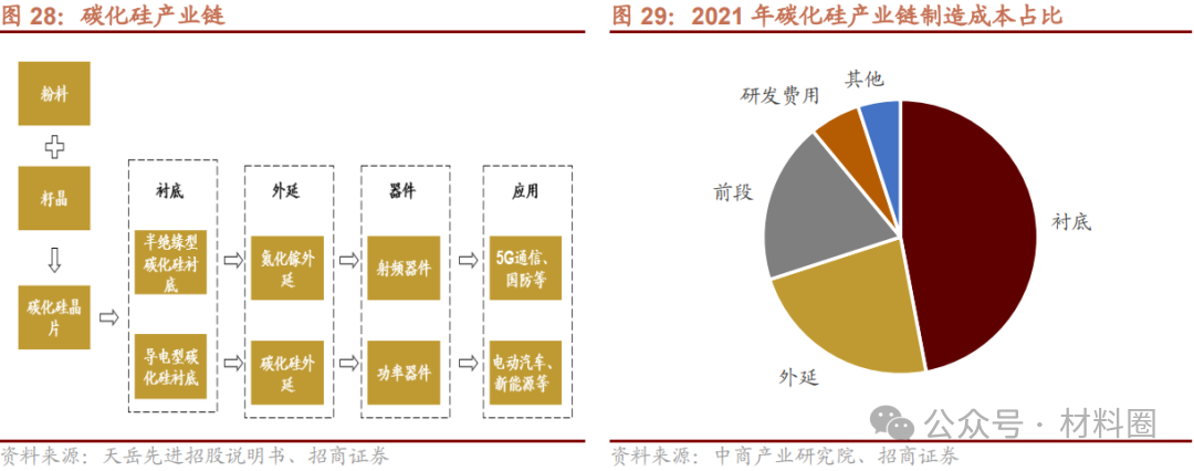 碳化硅生產過程分為單晶生長、外延層生長及器件制造三大步驟,對應的是產業鏈襯底、外延、器件與模組三大環節。其中,襯底和外延占據主要價值,在產業鏈中的成本占比分別為47%23%