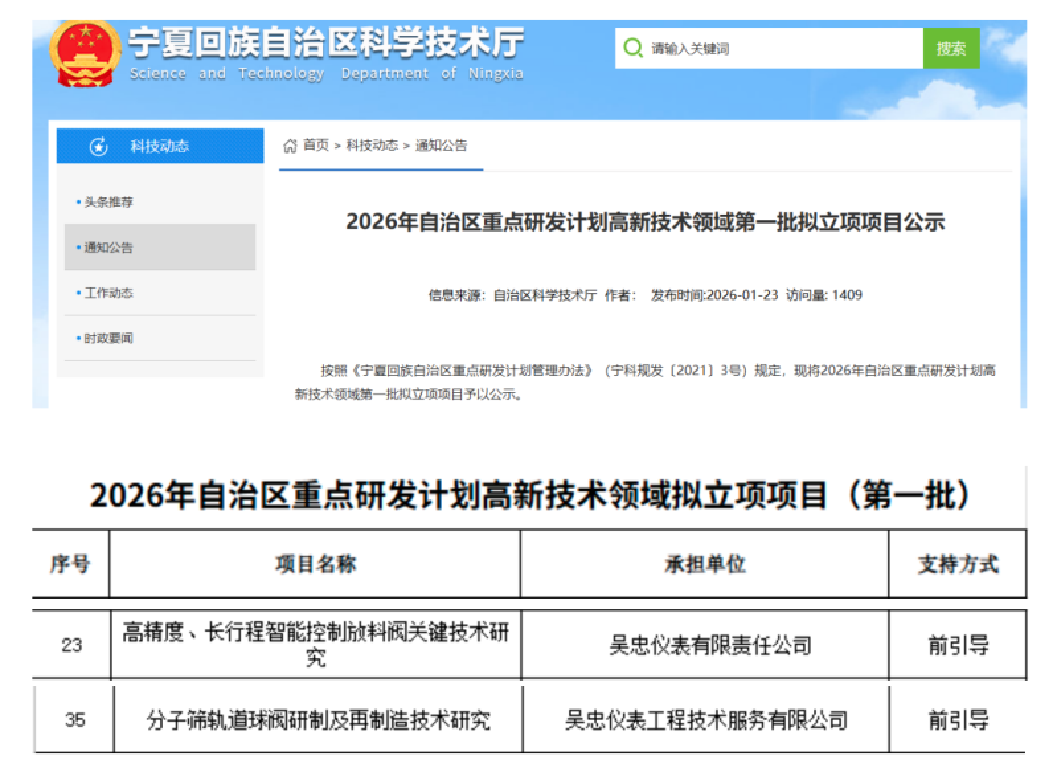 2026123日,寧夏回族自治區(qū)科學(xué)技術(shù)廳發(fā)布2026年自治區(qū)重點(diǎn)研發(fā)計(jì)劃高新技術(shù)領(lǐng)域第一批擬立項(xiàng)項(xiàng)目名單,吳忠儀表有限責(zé)任公司申報(bào)的“高精度、長行程智能控制放料閥關(guān)鍵技術(shù)研究”、吳忠儀表工程技術(shù)服務(wù)有限公司申報(bào)的“分子篩軌道球閥研制及再制造技術(shù)研究”兩個(gè)項(xiàng)目成功入選。