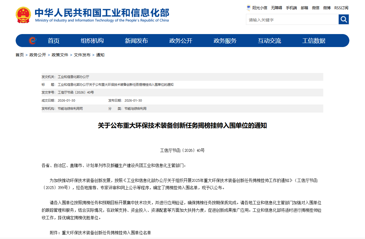 是工業和信息化部為破解生態環境領域關鍵技術裝備“卡脖子”難題組織實施的重要專項。該機制聚焦當前環保行業發展中面臨的核心技術與裝備瓶頸,旨在通過“懸榜攻關、能者揭榜”的方式,推動一批具有自主知識產權的關鍵技術與高端裝備實現突破,加速先進環保裝備的規模化應用與產業化發展,為我國生態文明建設與綠色低碳轉型提供堅實技術支撐。